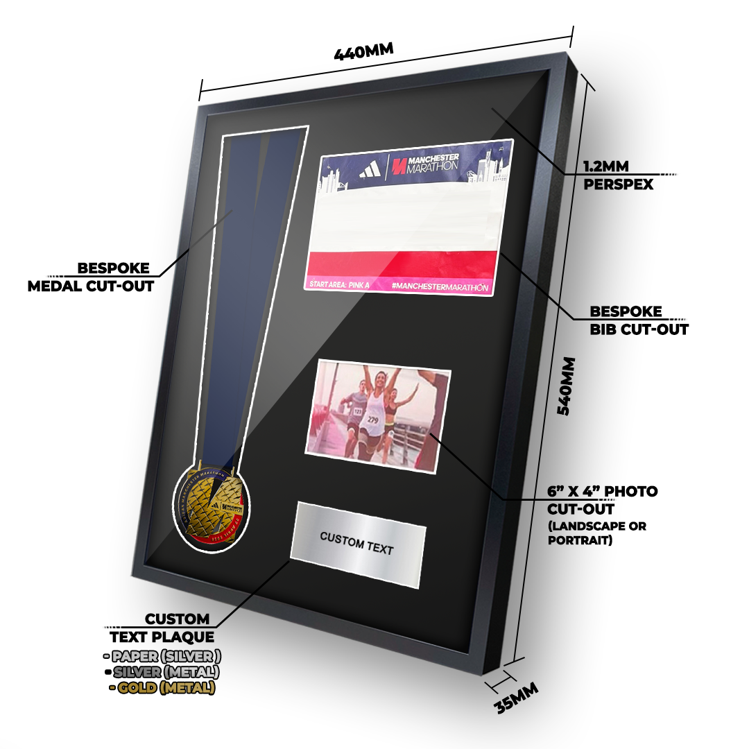 An aesthetically pleasing way to display your 2025 Manchester Marathon Medal and Race Number.