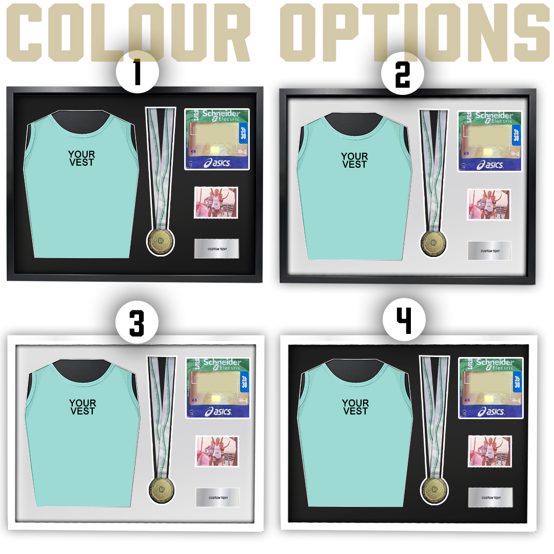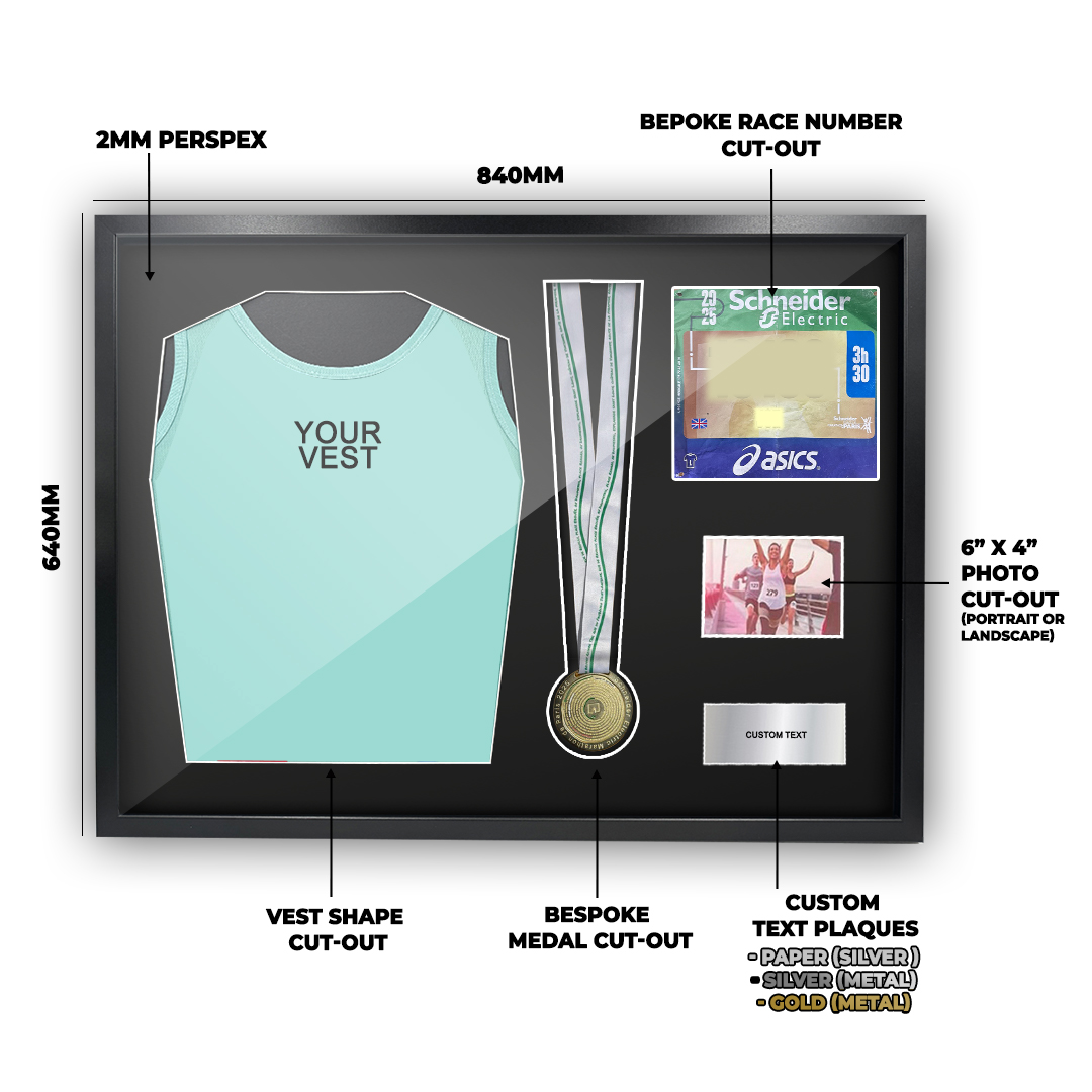 An aesthetically pleasing way to display your 2025 Paris Marathon Vest, Medal and Race Number.